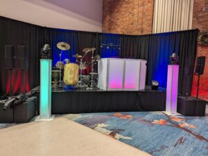 Événement pour votre levée de fond, Comprend; L’éclairage autour de la salle prêt du mur, éclairage de la scène, Table de sonorisation avec technicien, Système de son de 2400 watts, 2 micro sans fils.